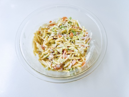 サラダの具材は、マカロニ・キャベツ・玉ねぎ・にんじん・ハム。